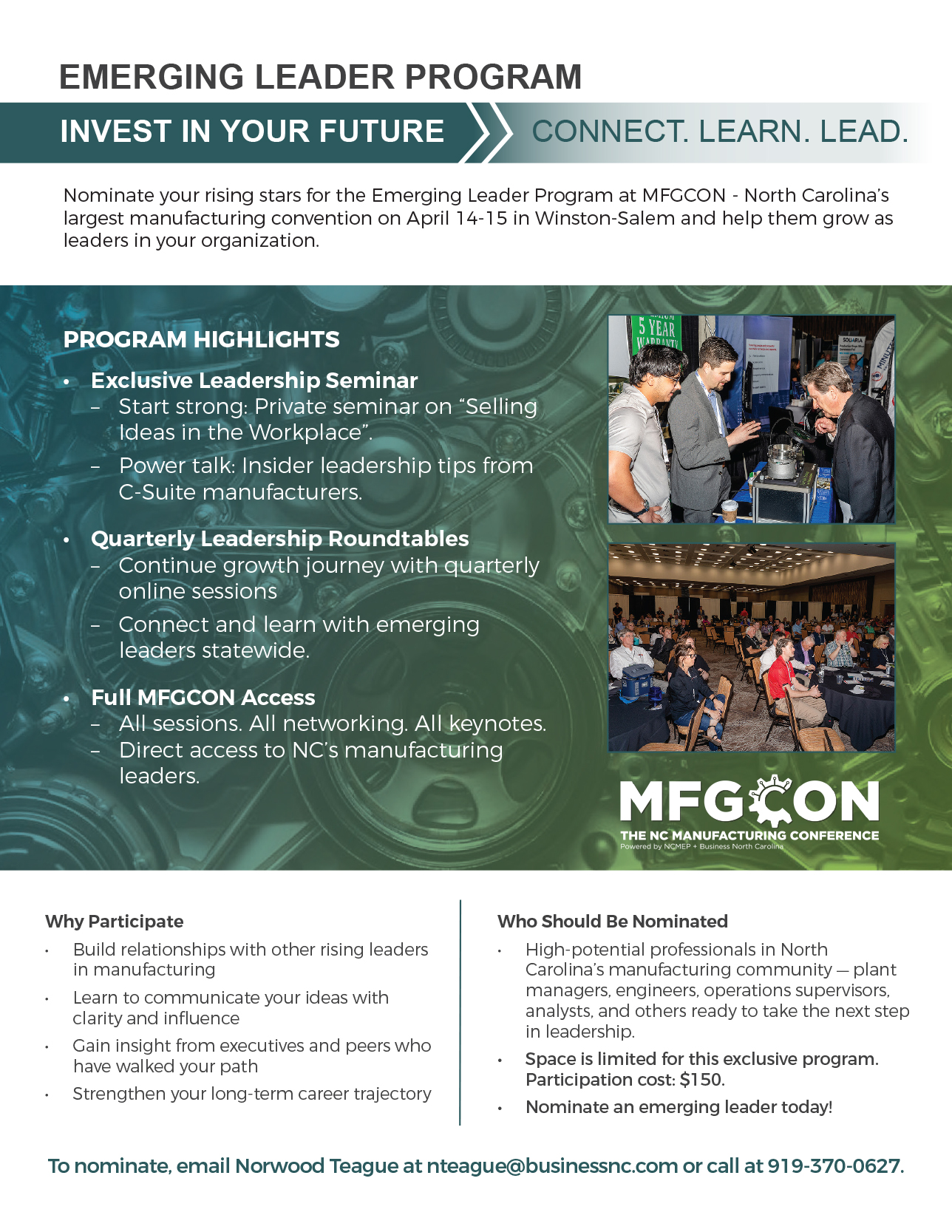 Nominate your rising stars for the Emerging Leader Program at MFGCON – North Carolina’s largest manufacturing convention and help them grow as leaders in your organization.