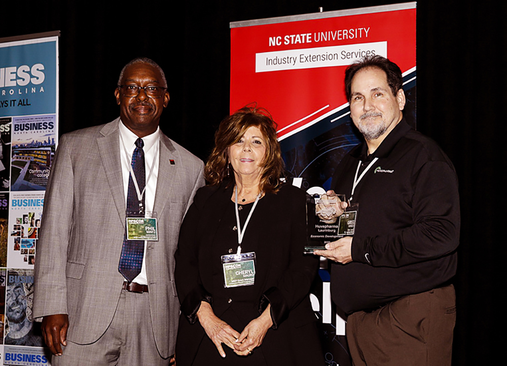 L-R: Phil Mintz, NC State University Industry Extension Services (IES); Cheryl Mauro, Economic Development Partnership of North Carolina (EDPNC); Greg Vance, Huvepharma – Laurinburg