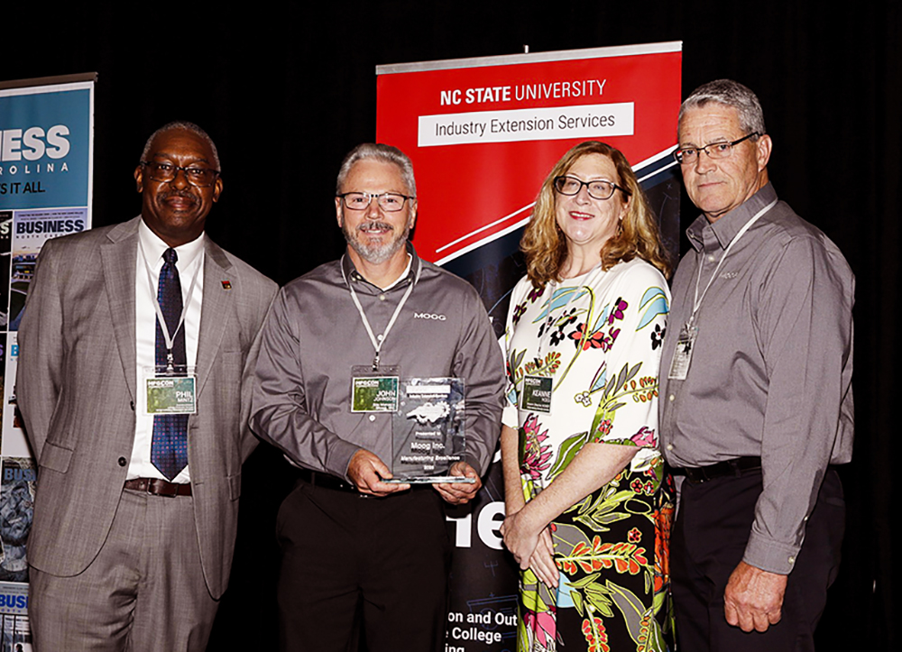 L-R: Phil Mintz, NC State University Industry Extension Services (IES); John Johnson, Moog Inc.; KeAnne Hoeg, North Caronlina Manufacturing Extension Partnership (NCMEP) / NC State University Industry Extension Services (IES): Richard Daley, Moog Inc.